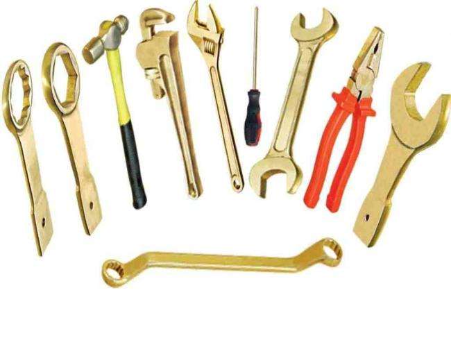 通常由鋼鐵材料制成的釬、鎬、錘、鉗、扳手、吊具等工具與設(shè)備在激烈動作或失手跌落時發(fā)生的摩擦、撞擊火花時隱蔽的點火源,因此在危險環(huán)境中安裝設(shè)備需要使用不發(fā)生摩擦及撞擊火花,甚至不產(chǎn)生熾熱高溫表面,由特殊材料制成的專用防爆工具。鋼鐵材料的硬度時隨含碳量的增加而提高的,而鋼鐵材料中的碳時產(chǎn)生摩擦火花的根源。防爆工具采用銅合金,在強度和硬度都較低的純銅中添加鈹、鋁、鈦、鎳、鎂等熔煉成銅基合金,強度和硬度得到提高,由于不含碳摩擦或撞擊時不會產(chǎn)生火花;銅合金的強度、硬度及導(dǎo)熱性都比鋼鐵材料好,局部摩擦點會發(fā)生塑性變形而避免摩擦能量集中在個別接觸點上,并且能將摩擦產(chǎn)生的熱量迅速分散到基體而減少摩擦撞擊點出現(xiàn)熾熱高溫的危險。當(dāng)前工業(yè)上已由鉸青銅、鋁青銅、J892銅合金等多種銅基合金成功地應(yīng)用在防爆工具中。防爆工具一般分為防爆手工具、防爆氣動和液動工具以及專用工具等,包括各種扳手、鉗子、錘鑿、刀具等。