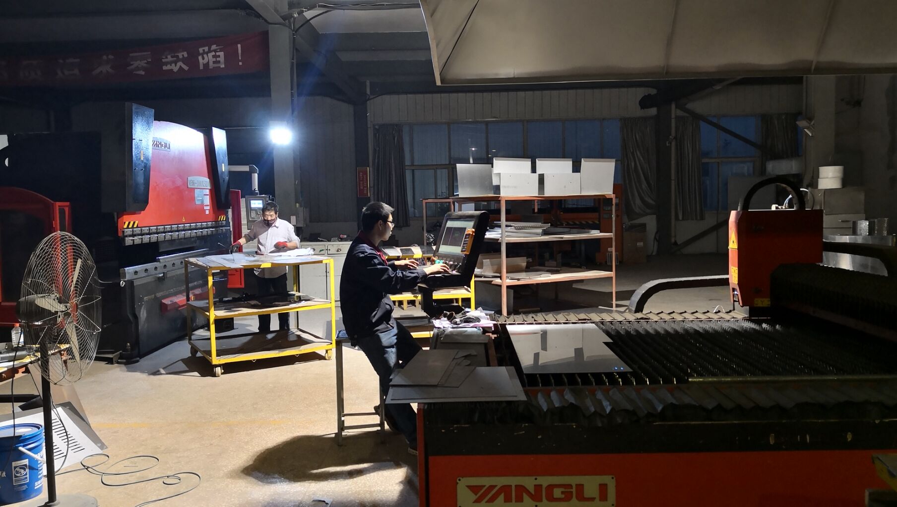 盡管天色已晚,領導和員工依然在廠區內商討產品細節問題。